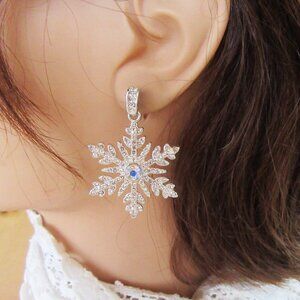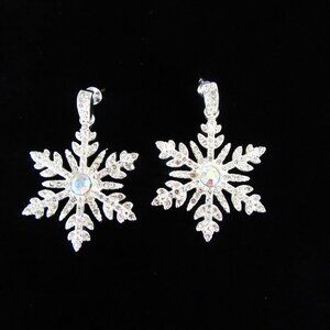 Sparkle for the holidays and winter season!! These dangling snowflake earrings hang approximately 1 3/4". Rhinestones are clear and center stone is aurora borealis.
