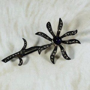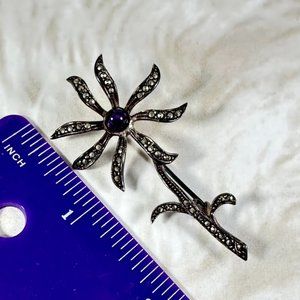 Silver-tone vintage abstract daisy pin with marcasite and purple stone
