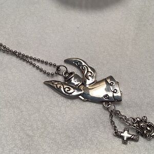 Temporarily hung on a link chain, this angel is waiting to be added to your favorite silvertone necklace.  She has an overall length of 3” and is 1 1/4” at its widest point.  Can also be currently used as a purse charm or key chain.