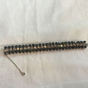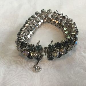 This 7 1/4” length bracelet is set in silvertone metal and features rows of aquamarine color crystals on the outsides with a row of clear crystals in between. Silver tongue clasp and safety chain.