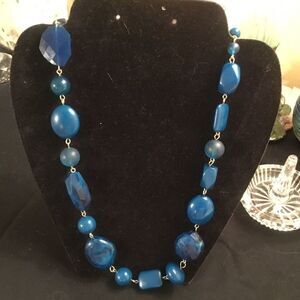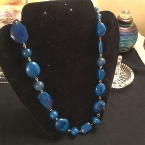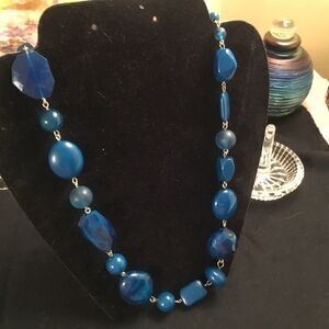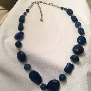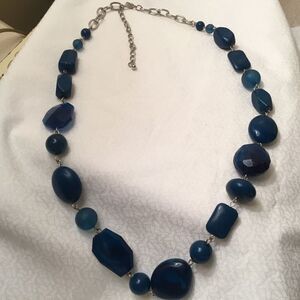 This adjustable silvertone necklace can be worn from 22” to 24 1/2” with its extender. Lobster claw clasp and extender in silvertone to match the chain. Beautiful acrylic blue beads of various shapes, some with faceting, some without are mixed together to make this stunner necklace. It almost glows against a black background! $12 each or bundle with 3 pieces of same price for $25 to save