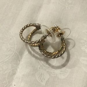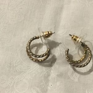 Petite hoops have a drop of 1/2”. Features two rows of braiding, one in goldtone and the other in silvertone. Post and clutch back. $8 each or bundle 3 for $15 to save. PW