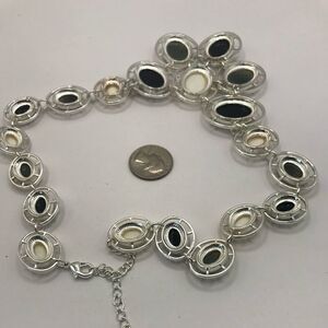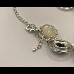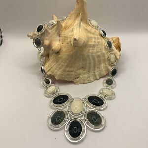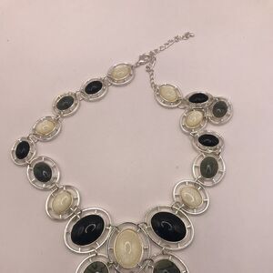 Beautiful silver tone with faux stone necklace. In new condition never worn, the length is 12” including the extension. The bib is 3 1/2” x 3 1/4”.