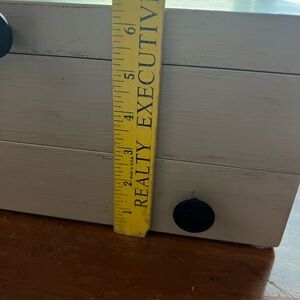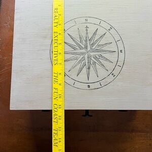 Refinished a wooden silverware storage box with chalk paint and added a compass design. Perfect for organizing your silverware or just use as decor. New hardware handles and front knobs added. Felt feet on bottom corners…original felt interior has some imperfections as shown in photos.(states it keeps silverware from tarnishing)…box weighs almost 9 lbs. (extra shipping of $5 is on seller as it will probably be close to 10 lbs wrapped taking into account the new ground charges for Poshmark ). Unknown maker.