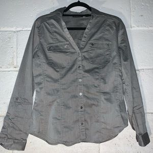 Gray Shirt with Silvery Shine! Silver Buttons Down the Front, on Both Front Pockets and on the Sleeves to Button up into a 3/4 Sleeve! Super Cute and Stylish While Still Being Professional! Really Cute Dressed Down with Jeans!