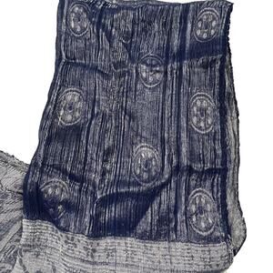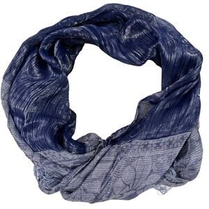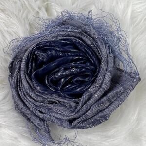 Thin, lightweight silvery scarf in shades of blue with metallic silver threading throughout. No tags. Due to light & screen variations, colors may vary slightly from the images