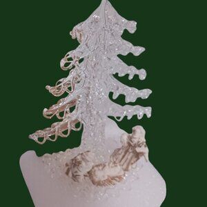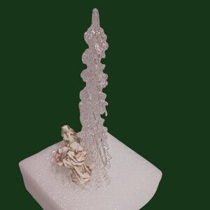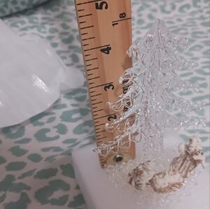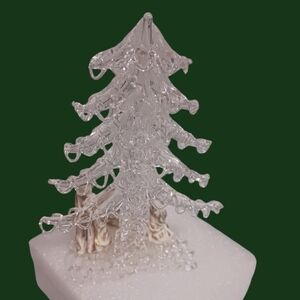 Elevate your holiday decor with this exquisite glass nativity scene featuring a beautifully crafted Christmas tree. is evident in the delicate details of the nativity figures, meticulously designed with an air of elegance. Is like new without box from smoke and pet free home.021
