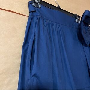 Navy blue cotton tiered wrap skirt from Silvia Tcherassi featuring an a-line shape, a tie waist, tassel detailing on waist ties and an over-the-knee midi length. Side pockets. 100% Cotton.