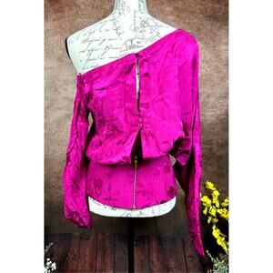 This blouse features 2 asymmetrical sleeves; one being draped with the volume of the upper part and the other with a slight volume. The top of this blouse is loose and draped while from the waist to hit it is more fitted and has a back zipper for closure.One-shoulder neckline; button/keyhole back