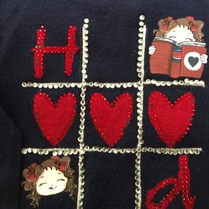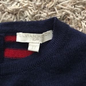 3 years. Navy blue with red and silver detail. Accented with rhinestones. Some of rhinestones are missing (see pictures). Back of Dress / Tunic has red and navy stripes. Button closure. Banded at bottom with Heach dolls logo tag. 50% wool 50% acrylic.