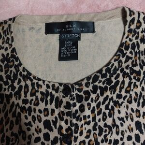 Silx By August Silk Women's Leopard Print Silk blend button Cardigan Size Small. Silk and nylon blend. 3/4 sleeves. Round neck. button front. MEASUREMENTS PROVIDED.