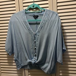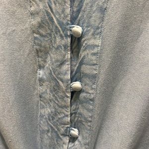 Sim & Sam Faded denim blouse. Size Large.Soft fabric. Tie front, covered buttons