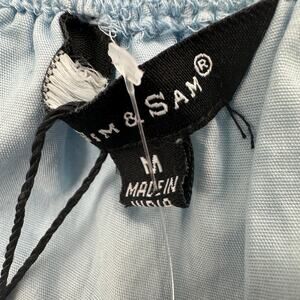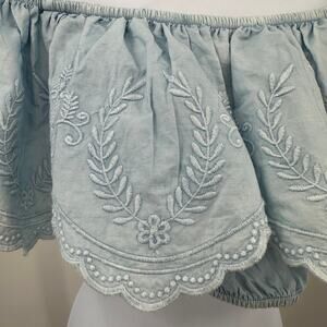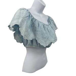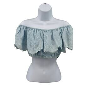 Sim & Sam Off-the-Shoulder Cropped Top Women’s Size Medium – Style 170038, Bleach Wash Blue Colorway, Lightweight Cotton Fabric, Off-the-Shoulder Neckline, Short Sleeves, Scalloped Hem, Delicate Embroidered Detailing, Cropped Length, Relaxed Silhouette, Feminine and Airy, Perfect for Summer Styling, Casual Outfits, or Festival Wear.