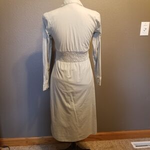 Sim & Sam Womens Size Small Shirt Dress 100% Cotton Made in India Midi Length Light Sage Green Ruched Stomach Long Sleeve Button Front Office Gremlin Preppy Classic Layering
