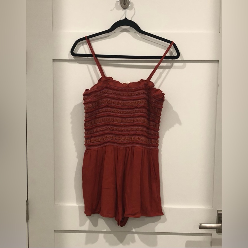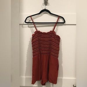 Sun & Sam smocked romper. Earthy rust and blue color. Spaghetti straps that adjust and can be removed. Textured. Side pockets. Stretchy, pulls on. Shorts are lined. Size M.