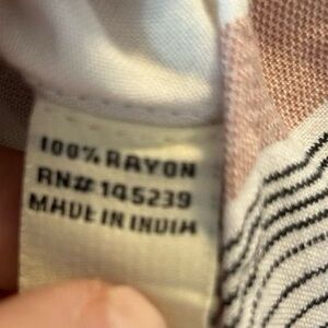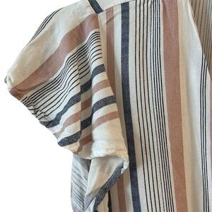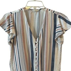 The Sim & Sam blouse is a women's size small, featuring a multicolor striped pattern. Made from rayon, it has a basic style with a V-neck and short ruffle sleeves. The blouse includes a button front and tie front, offering a regular fit suitable for casual occasions. It is machine washable and manufactured in India. The item is pre-owned but in excellent condition.