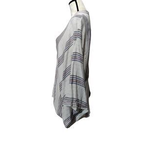 Sim & Sam white open front beach cover up or kimono with blue and metallic stripes. Loose wide open sleeves. Elastic at the back for a more flattering fit.