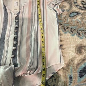 Cute top. Ties in front. Light pink, blue and cream. Flouncy short sleeves. Measurements in photos.