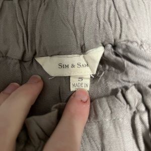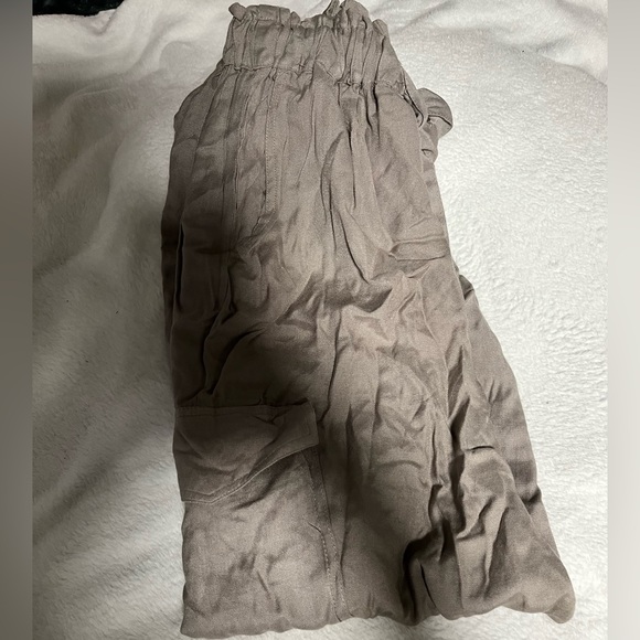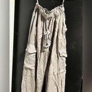 Grey, flowey, long, foot length pants. Tie waist, no rips or stains. Never been worn.