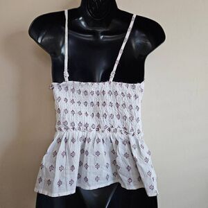 This is a tank top by Sim & Sam. It is white with red and blue embroidered details throughout. There are ruffles at the neckline and the straps are adjustable.