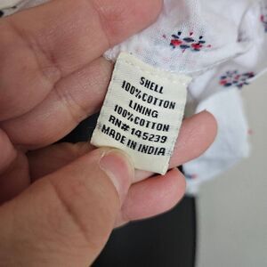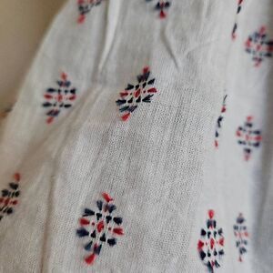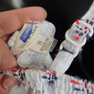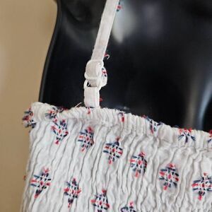 This is a tank top by Sim & Sam. It is white with red and blue embroidered details throughout. There are ruffles at the neckline and the straps are adjustable.