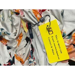 Simier Fariry Women's Modest Stretch Adjustable Waist Blouson Crew Neck Short Sleeve Dress with pockets in a white with orange, blue & red floral print.