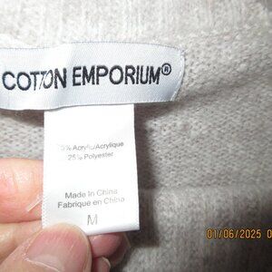 This is a COTTON EMPORIUM cowl neck sweater in size medium. It is made of 75% acrylic and 25% polyester, featuring a cowl neck and long sleeves. The sweater comes in a light gray & dark gray color combination and has a basic style.