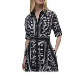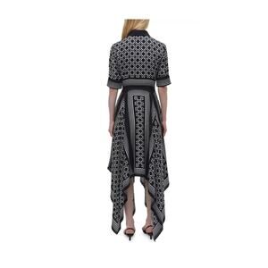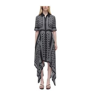 This short-sleeve handkerchief midi cover-up features a scarf print and is designed with a flowing silhouette and asymmetrical hem. Point collar