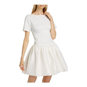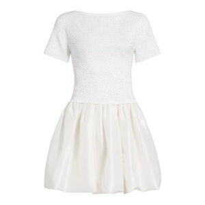 This Kenz combo minidress from SIMKHAI is composed of a fitted sequin-embellished rib-knit top and flared taffeta skirt.