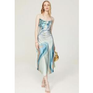 Jonathan Simkhai Nellie Blue Watercolor Cowl Neck Satin Midi Dress Women's 4