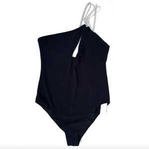 New with tags Simkhai Sainte Diamante one shoulder swimsuit with crystal strap and cut-out accent. Suspended from a single sparkling strap, the Saint Diamante swimsuit is a dazzling choice for hot summer days. Cut from premium quick-dry fabric, the one-piece swimsuit has a key-hole cut-out at the décolletage and offers medium coverage at the bottom.
