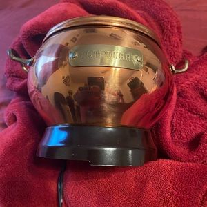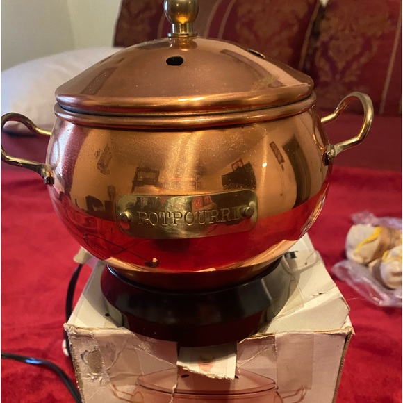 The electric simmering pot copper plated finish pure nickel lined heat resistant base and you use water well the instructions is in the box do not use outside do not touch it why in is on because it got hot and make sure you have in a safe place from children and it do maker a different how longhorn you want to be on for water the papers is in the box for more information ty