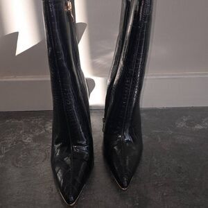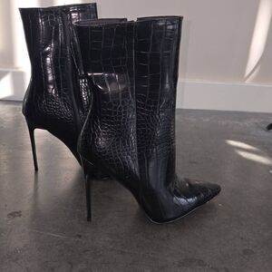 it's all about these booties. featuring metal toe cap detailing and a stiletto heel. style them up with faux leather pants, crop and blazer.