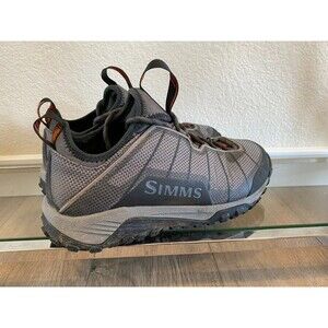 The Simms Flyweight Wet Wading Shoes in men's size 9 feature a Vibram sole and neoprene interior, making them perfect for fishing in wet environments. These lace-up wading boots are designed for waterproof and breathable performance, with a rubber outsole for traction. The gray boots with a solid pattern are ideal for summer, fall, and spring fishing trips, showcasing the Simms brand logo as accents. Perfect for any angler looking for a comfortable and functional wading shoe option.