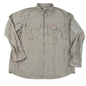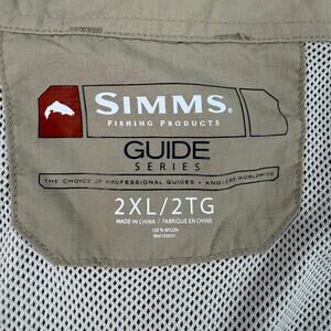 Simms Guide Series vented fishing shirt in men's size 2XL. Tan. Roll tab sleeves. Pockets. Nice pre-owned condition and comes from a smoke-free environment,