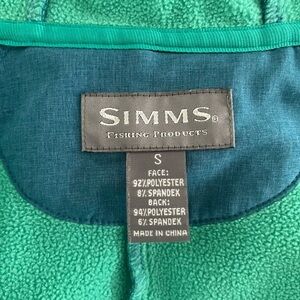 Simms hooded soft shell jacket. Fleece lined. Water resistant exterior. Adjustable drawstring hood. Full zip front. Front kangaroo pockets with smaller zippered pockets. Womens Size: small. TCO Fish logo embroidery on left chest. Excellent condition. Smoke free home