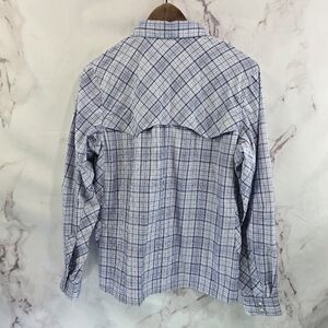 Simms Shirt Women Medium Purple Blue Button Up Long Plaid Vented Fishing Guide