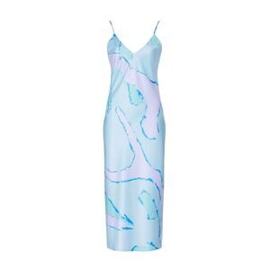 Blue printed crepe (100% Polyester). Shift. Sleeveless. V-neckline. 50" from shoulder to hemline. Made in the USA.