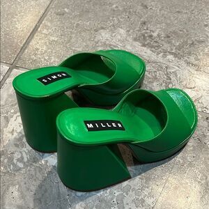 Step out in style with Simon Miller's vibrant green platform sandals. Perfect for adding a pop of color to any outfit.