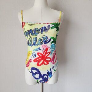 Simon Miller Linkky One Piece High Cut Swimsuit Square Neck Double Layer Pastel Print 86% Polyester 14% Spandex