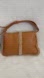 Brown leather. Mini bag. Magnetic button closure. Open pockets. Attached adjustable strap.