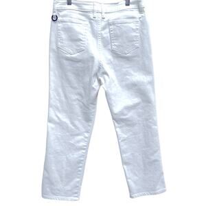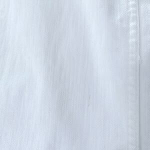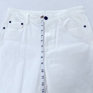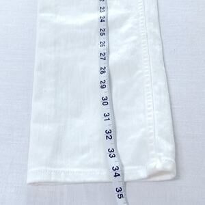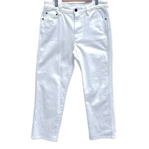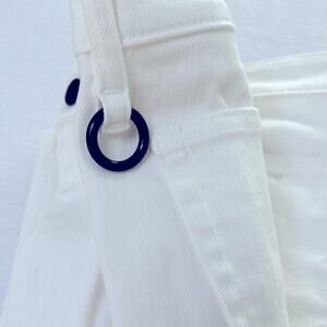 Size 28, straight, relaxed fit, high Waisted, minor discoloration spots, and hem, round metal ring, white ivory color