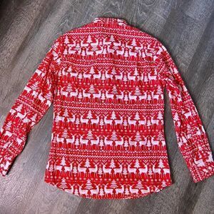 This listing is for a NWT, Simon banks, Christmas button up red shirt in size small. The shirt, features, reindeer, Christmas trees, and all over Christmas theme.
