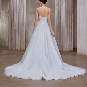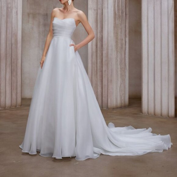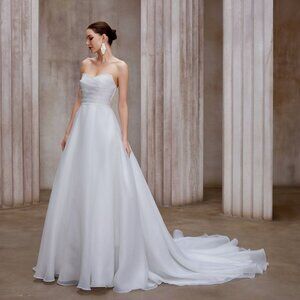 This timeless strapless bridal gown is the definition of effortless elegance. Designed with a softly draped sweetheart neckline, the bodice features delicate pleating that creates a flattering, structured silhouette while remaining light and romantic. The cinched waist flows seamlessly into an airy A-line skirt, crafted from layers of soft chiffon that move beautifully with every step.