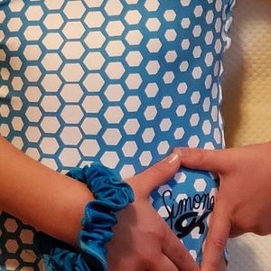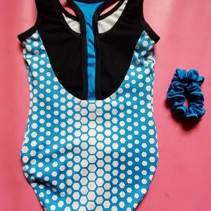 Simone Biles GK Elite Collection spotted sport tank gymnastics leotard. Only worn once. Size: Child Medium. To help with sizing, the gymnast show in the pictures is 6 years old, 3' 9" tall and 47 lbs. Comes with matching scrunchie.
