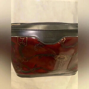 Elegant Simone Firenze small purse, beautifully crafted in Italy. Features a rich red exterior with black trim and a sophisticated chain/rope design print. Compact yet stylish, perfect for carrying essentials while adding a touch of luxury to any outfit.