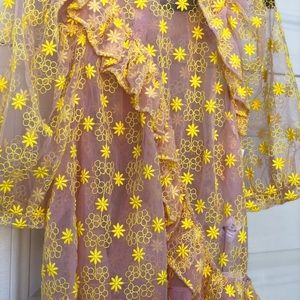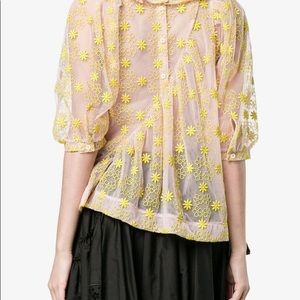 Wide, demure frills sweep across a diaphanous mesh blouse alight in sunny floral embroidery. - 24" length (size 12 UK) - Back button closure - Jewel neckline - Half sleeves with banded, single-button cuffs - 55% cotton, 30% nylon, 15% polyester - Dry clean - Made in Italy