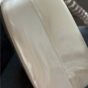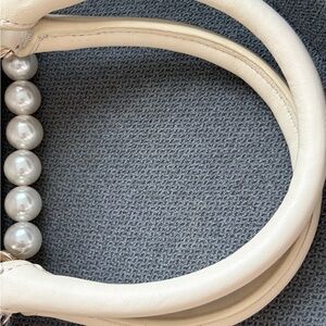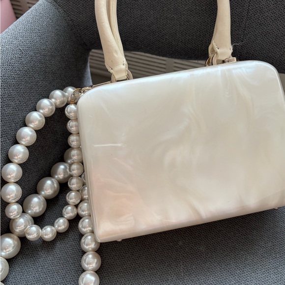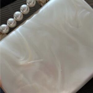 Detachable beaded perspex faux-pearl shoulder strap · Twin buffed leathercarry handles at top · Bumper studs at base · Hinged opening with magnetic fastening · Patch pocket at three-compartment interior · Cotton twill lining in beige · H6 x W8 x D3.5 in Supplier color: Pearl
