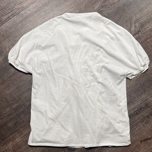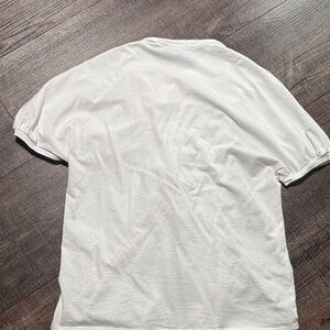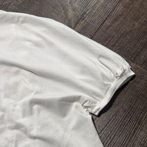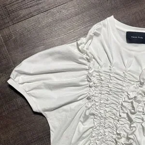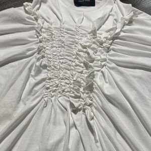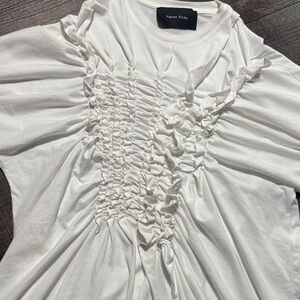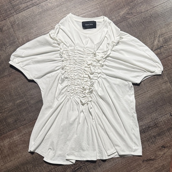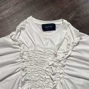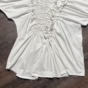 Elegant white top with ruched detailing. Short sleeves. Loose fit. Perfect for a chic look. Pristine condition. No stains, holes, snags of any sort. Size XS