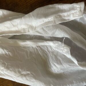 Silk blend. Ecru color. Puff sleeves. Open at wrist. Raw hem at bottom. Layered look. Great with slacks or skirt when you need to be dressed up or with jeans for a casual, crisp look. Fabric is inherently wrinkled.